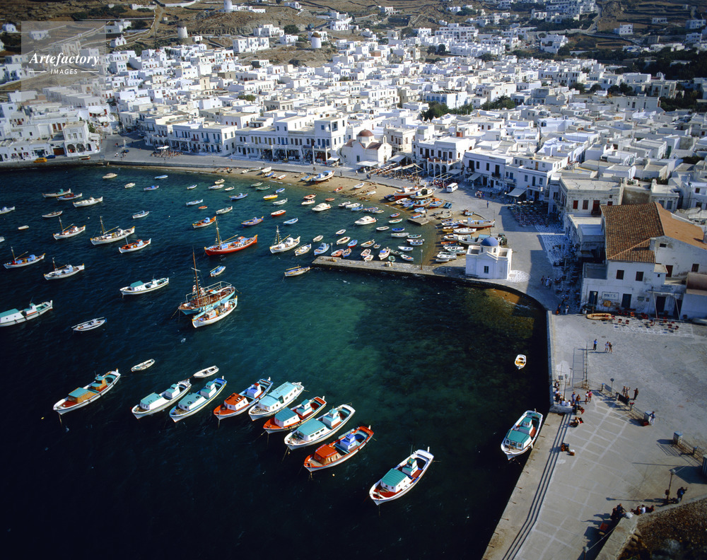 エーゲ海,Aegean Sea,キクラデス諸島,Cyclades,ミコノス島,Mykonos,ミコノス島の港,港,Port,漁船,Fishing boat,島,Island,海,Sea,海洋,Ocean,航空写真,Aero photo