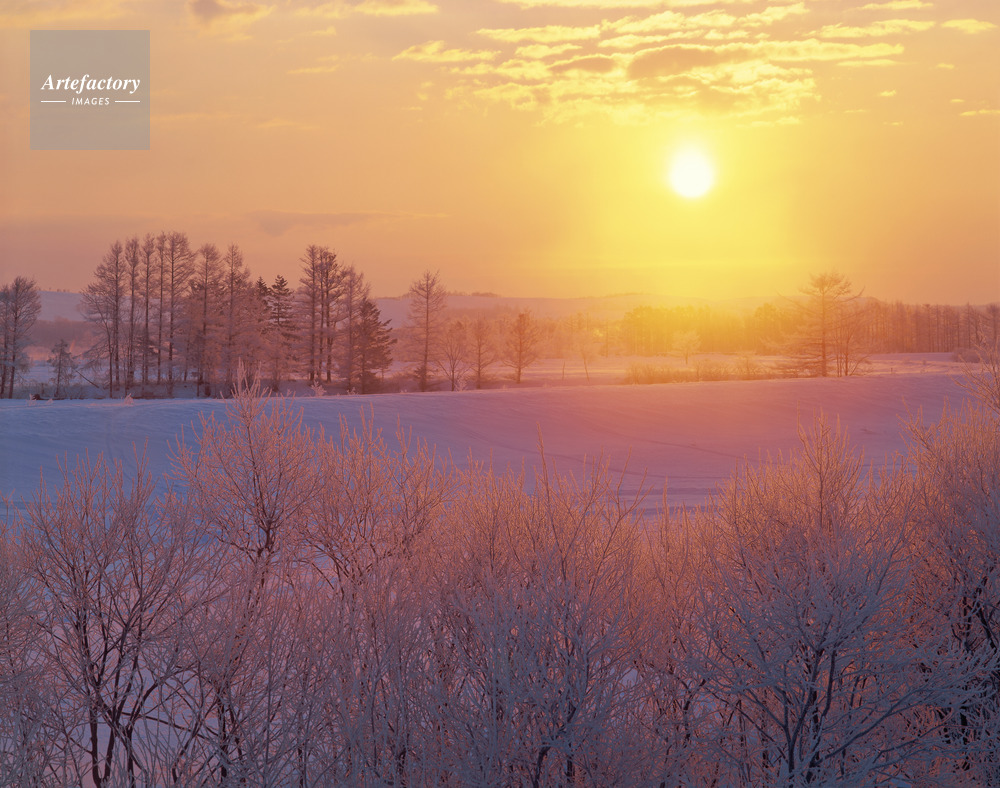 | 作品タイトル | 朝日に染まる雪原と霧氷の木立 | モデルリリース | なし | |