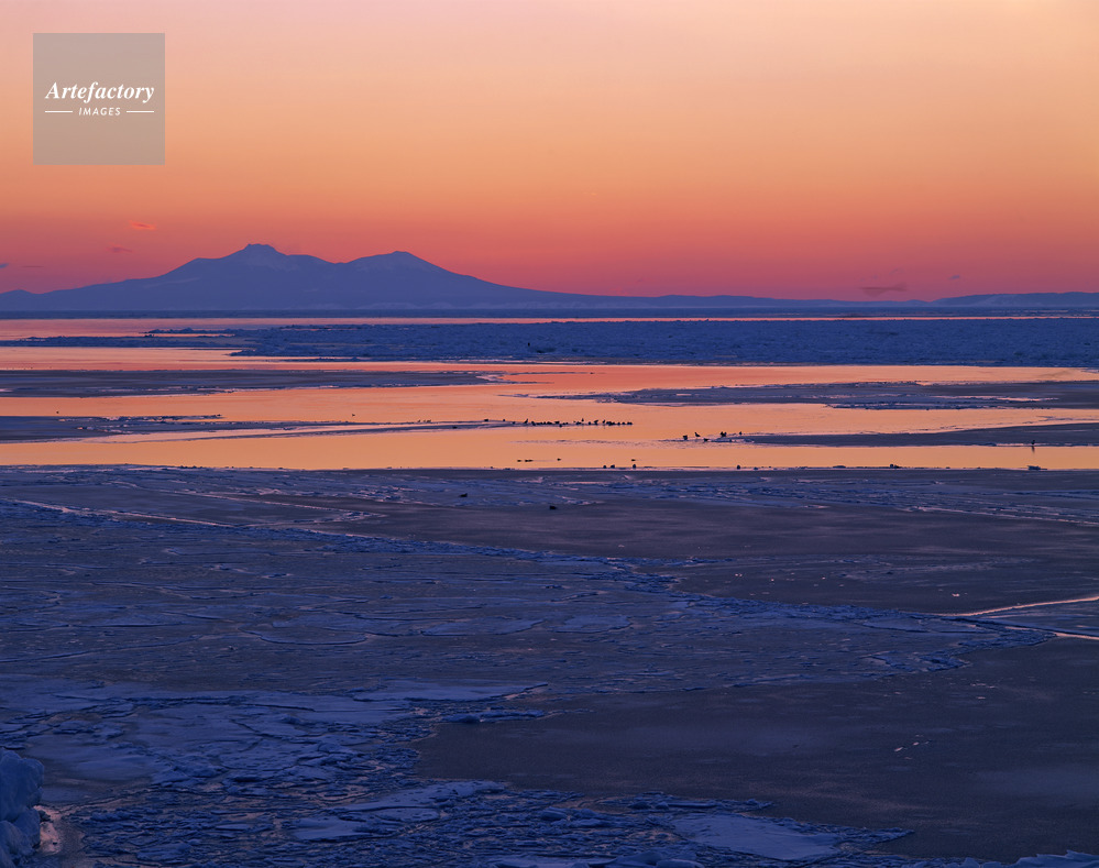 | 作品タイトル | 黎明に染まる流氷と国後島羅臼山 | モデルリリース | なし | |