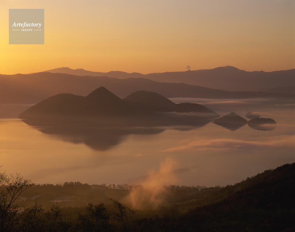 | 作品タイトル | 朝日に染まる朝霧漂う洞爺湖と中島 | モデルリリース | なし | |