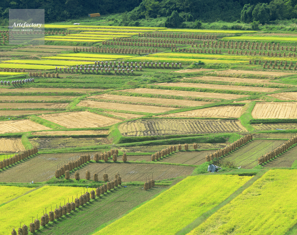 | 作品タイトル | 椹平(くぬぎたいら) 稲刈りと杭掛けの頃 棚田百選 | モデルリリース | なし | |