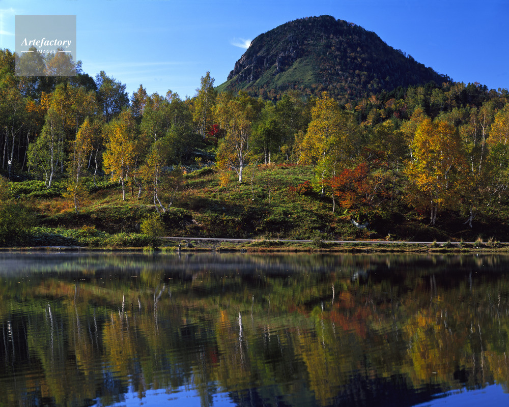 | 作品タイトル | 黄葉の木戸池から志賀高原のシンボル、笠ヶ岳を望む | モデルリリース | なし | |