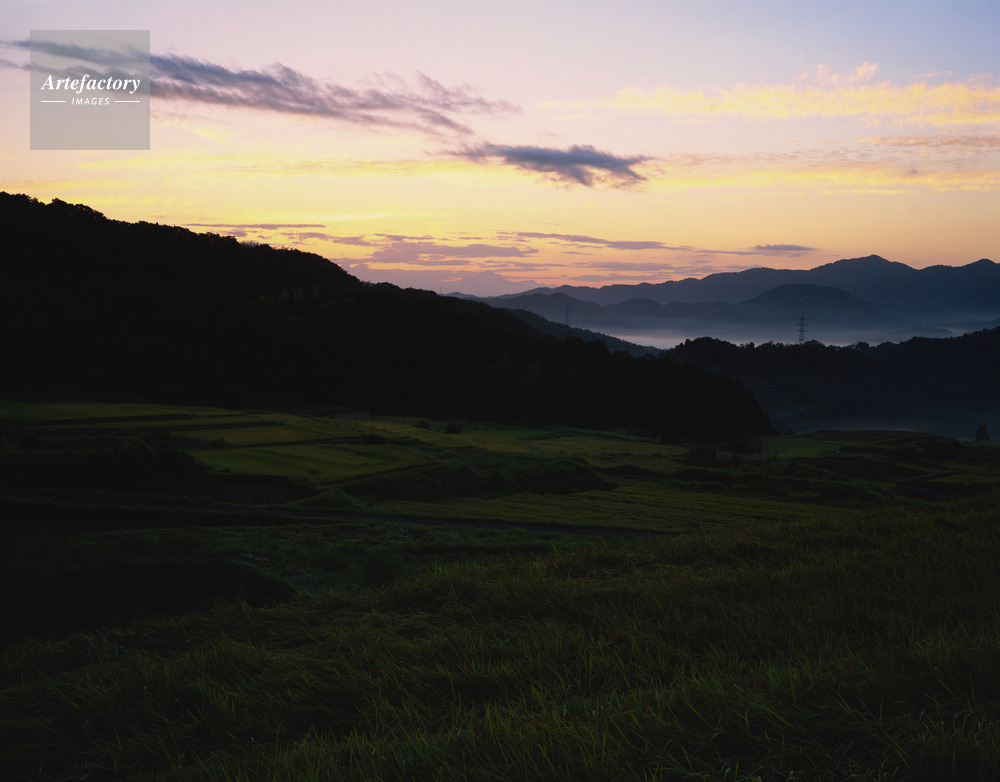 作品タイトル     山王寺・稲刈りの頃、朝景色の大山遠望 棚田百選 モデルリリース なし