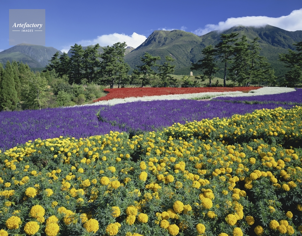 | 作品タイトル | マリーゴールドサルビア咲くくじゅう花公園からくじゅう連山 | モデルリリース | なし | |