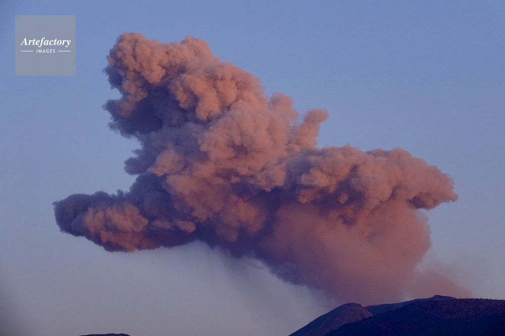 | 作品タイトル | えびの市内から見る新燃岳噴火の噴煙,夕陽に染まる | モデルリリース | なし | |