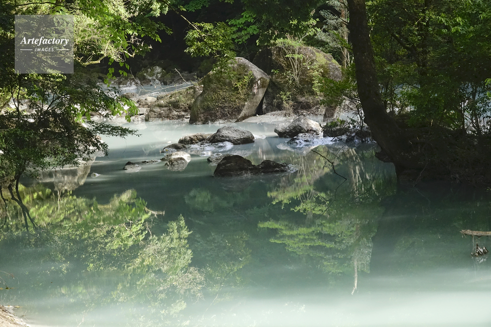| 作品タイトル | 噴火した硫黄山の白濁した温水が流れ込んだ河川の新緑 | モデルリリース | なし | |