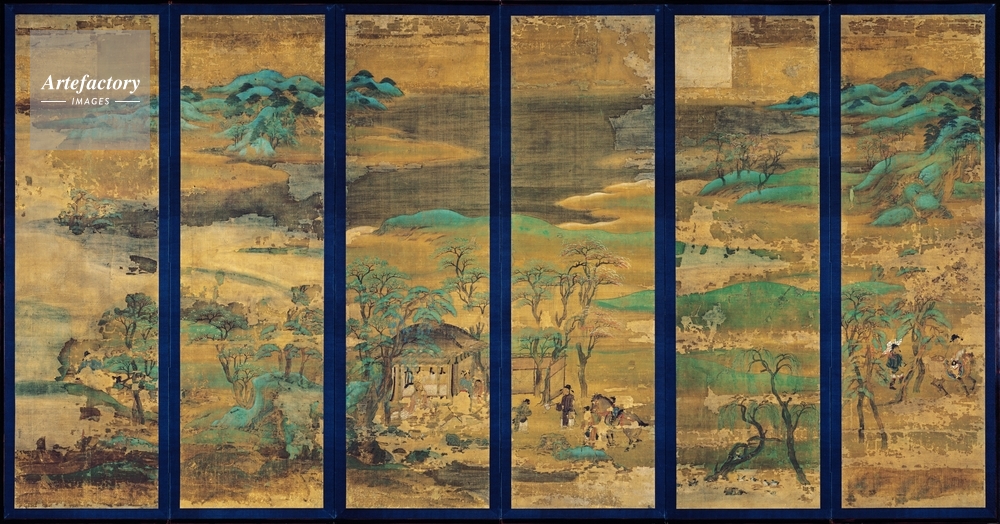 | キャプション | 絹本著色,6曲1隻, 中国的風俗を描いたいわゆる唐絵(からえ)の山水屏風で、かつて東寺に伝来したもの。もともとは宮中や貴族の邸宅の室内調度として作られたと思われる。平安時代の屏風絵としては唯一の遺品である。 縁取りのある6面(扇)から構成されるが、全体は連続した横長の図様になっている。近景には人物とそれをとりまく景観および花を咲かせた藤蔓や樹木をやや大きく表し、中・遠景になだらかな丘陵と横にひろがる水景、さらに遠山を配している。ゆったりとしたのどかな春の景色とみなされる。図様の中心をなすのは向かって右から第3・4扇下方にある庵 (..) | 制限事項 | ||