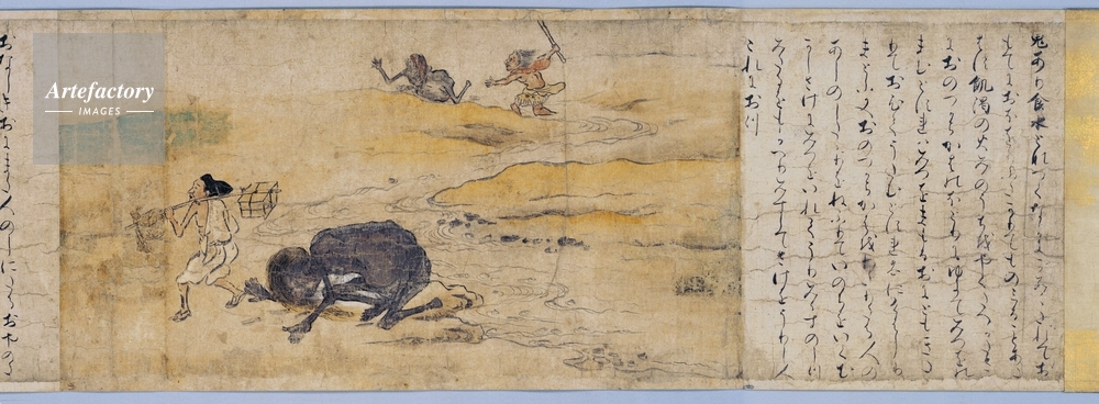 | キャプション | 紙本著色 ,1巻, 餓鬼草紙は、六道のうち餓鬼の世界を描いたもので、平安時代後期に末法思想が流布し、六道に対する関心の高まりを背景に描かれた。京都国立博物館本(以下、京博本)は、餓鬼の救済に関する説話を集めたものである。 第1、2段は、食水餓鬼の救済の話で、第1段には三十六餓鬼のうちのひとつ、食水餓鬼の受苦の様子を描き、第2段は、餓鬼道に堕ちた者も、残された人びとの供養によって救われることを説く。絵は盂蘭盆(うらぼん)に卒塔婆に水を掛ける人びとを描くが、生き生きと描き出された寺の門前の賑わいは、風俗画としても見ごたえがある。 (..) | 制限事項 | ||