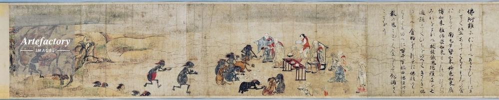 | キャプション | 紙本著色 ,1巻, 餓鬼草紙は、六道のうち餓鬼の世界を描いたもので、平安時代後期に末法思想が流布し、六道に対する関心の高まりを背景に描かれた。京都国立博物館本(以下、京博本)は、餓鬼の救済に関する説話を集めたものである。 第1、2段は、食水餓鬼の救済の話で、第1段には三十六餓鬼のうちのひとつ、食水餓鬼の受苦の様子を描き、第2段は、餓鬼道に堕ちた者も、残された人びとの供養によって救われることを説く。絵は盂蘭盆(うらぼん)に卒塔婆に水を掛ける人びとを描くが、生き生きと描き出された寺の門前の賑わいは、風俗画としても見ごたえがある。 (..) | 制限事項 | ||