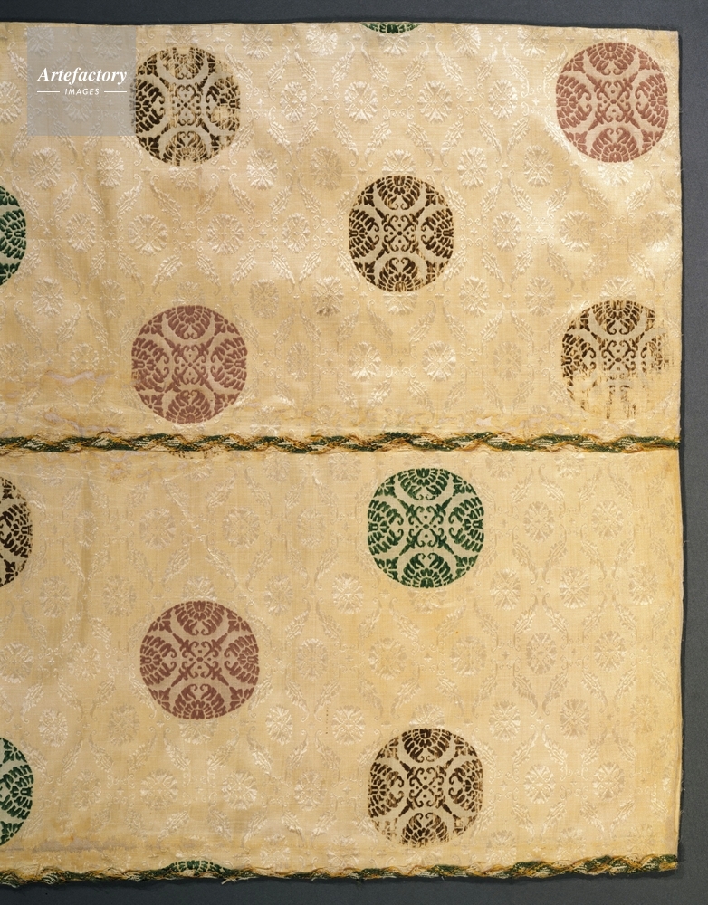 | キャプション | 白小葵文浮線綾丸文二重織,1帖, 衾は、寝るとき身体をおおう掛けふとんのような夜具で、他の装束と同様に公家が用いた伝統的な有職織物(ゆうそくおりもの)で作られている。これは白地に小葵文(こあおいもん)を浮織で織り出し、上文は別の色糸で浮線綾(ふせんりょう)を表した二陪織物(ふたえおりもの)である。二陪織物は公家の織物のなかでももっとも品格の高い織物として尊ばれた。 | 制限事項 | ||
