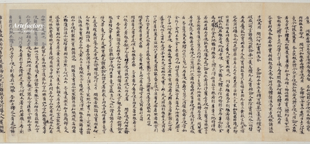 | キャプション | 紙本墨書,8巻, 『浄名玄論』全8巻は、中国の三論宗の教学を大成した嘉祥大師吉蔵(549~623)が著した『維摩詰所説経』(姚秦時代の鳩摩羅什訳)の綱要書である。浄名とは、音写語である維摩詰(梵VimalakTrti)の漢訳であり、維摩詰という在家居士が活躍することで知られる『維摩詰所説経』は、中国や日本でもしばしば注釈が著され、在家仏教徒の間で支持された経典である。 この写本は全体8巻のうち、巻第四の巻末には「慶雲参年十二月伍日記」、巻第六の巻末には「慶雲三年十二月八日記」という書写奥書があり、わが国の元号を用いて書写年 (..) | 制限事項 | ||