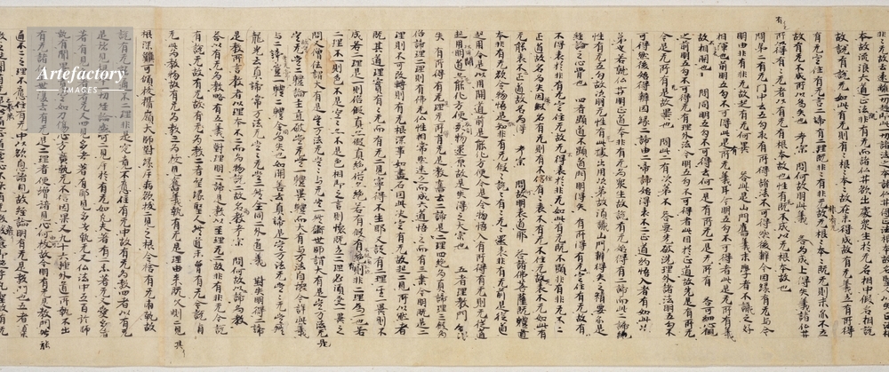 | キャプション | 紙本墨書,8巻, 『浄名玄論』全8巻は、中国の三論宗の教学を大成した嘉祥大師吉蔵(549~623)が著した『維摩詰所説経』(姚秦時代の鳩摩羅什訳)の綱要書である。浄名とは、音写語である維摩詰(梵VimalakTrti)の漢訳であり、維摩詰という在家居士が活躍することで知られる『維摩詰所説経』は、中国や日本でもしばしば注釈が著され、在家仏教徒の間で支持された経典である。 この写本は全体8巻のうち、巻第四の巻末には「慶雲参年十二月伍日記」、巻第六の巻末には「慶雲三年十二月八日記」という書写奥書があり、わが国の元号を用いて書写年 (..) | 制限事項 | ||