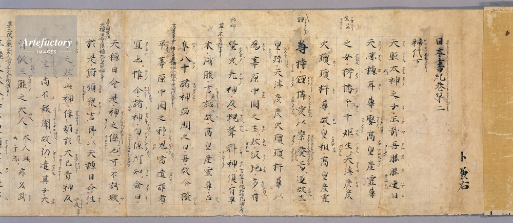 | キャプション | 紙本墨書,2巻, 諸国の神社に仕えて卜占(ぼくせん:占い)を家業とした卜部家に伝来した『日本書紀』の古写本。卜部家は鎌倉時代末より吉田姓を名乗っており、この2巻を「吉田本」と呼ぶのはこのため。 ちなみに吉田家からは、室町時代に吉田神社の神主吉田兼倶(1435~1511)が出て「吉田神道」を確立、神道界で大きな勢力となった。 下巻には卜部兼方(生没年不詳)が弘安9年(1286)春に「裏書」を書き加えたことを記した奥書がある。この奥書と本文の筆跡が同じであるところから、本文もまた兼方によって筆写されたものであることがわかる。全 (..) | 制限事項 | ||