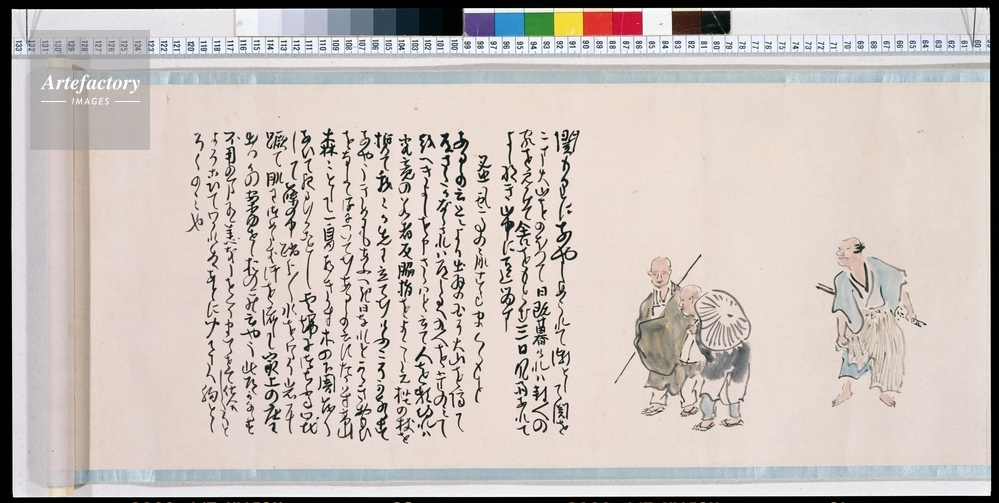 | キャプション | 紙本淡彩,2巻 本紙各縦29.2cm 全体縦31.0cm, 芭蕉の『奥の細道』の本文を書写し、それに蕪村が俳画を新たに描き加えたもの。全二巻からなる。 | 制限事項 | ||