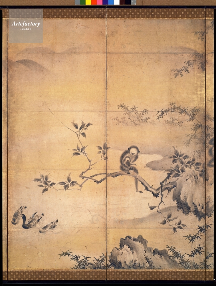 | キャプション | 紙本墨画,1双 縦148.3cm 横339.0cm, 古来「式部(しきぶ)」印は「龍杏(りゅうきょう)」と読まれ、祥啓あるいは仲安真康と同一人とされたが別人である。その経歴等一切不明であり、他に遺る「富士八景図」に着賛する建仁寺第262世常庵龍崇(じょうあんりゅうすう)の没年(1536)から、およその活躍時期を知るにとどまる。本図に見るやや繁雑なまでの皴法は明らかに祥啓の系統を引く鎌倉派画人のそれを示し、また緊密な画面構成法には狩野派からの影響も看取される。擬人化されてあらわされた猿の表情がほほえましい。 | 制限事項 | ||