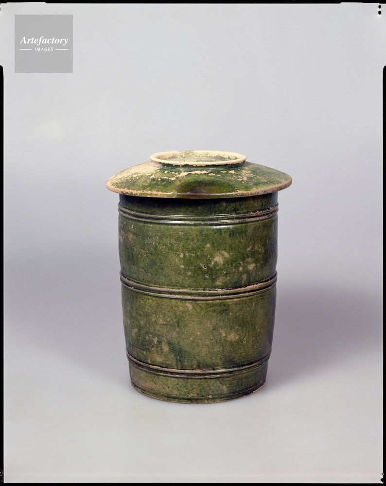| キャプション | 1合 総高 25.9 cm 身高23.5cm 身口径17.4cm 蓋直径20.7cm 蓋高3.4cm, 円筒形の身に皿形の蓋をともなった容器で、経塚に埋納する経典を納めた経筒の容れ物である。身の外面には各2条の凸帯が上・中・下3段にめぐっている。底はややすぼまった平底である。蓋は高台付の皿形に作られている。釉は濃緑色で、身は底部内面以外全面に、蓋は内外全面にかけられている。10世紀の製品であるが、緑釉陶器としてはめずらしいものである。類例としては他に、猿投窯(さなげよう)で作られたものが1点見られるのみである。 | 制限事項 | ||