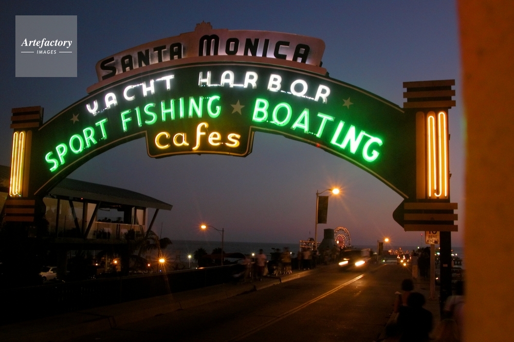 | キャプション | Sign at the entrance to Santa Monica Pier, with the pier and ferris wheel in the distance and Lobster restaurant at left, last night. | 制限事項 | ||