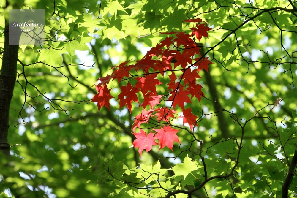| 作品タイトル | 新緑のなかの紅葉,葉に糖ガ溜まると赤くなります | モデルリリース | なし | |