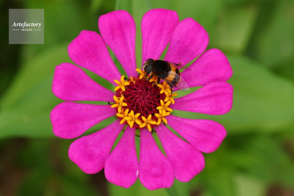 | 作品タイトル | ヒャクニチソウの花に止まるオオハナアブ | モデルリリース | なし | |