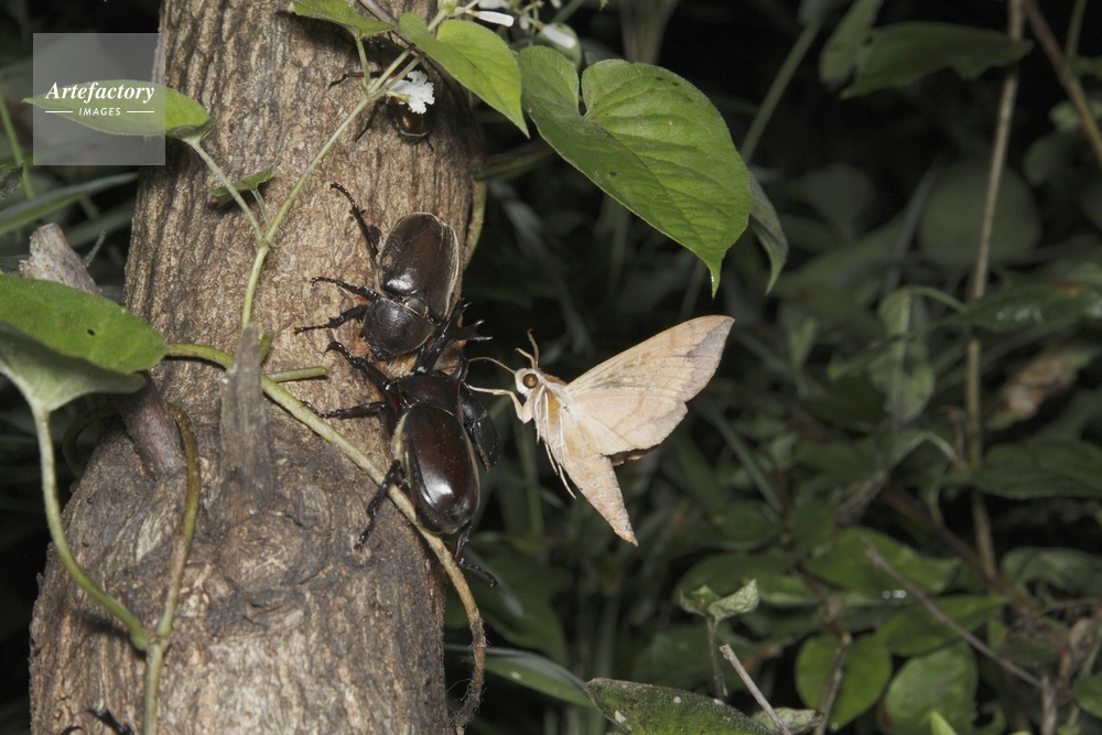 | 作品タイトル | 樹液に集まるカブトムシと樹液を吸いにきたクルマスズメ | モデルリリース | なし | |