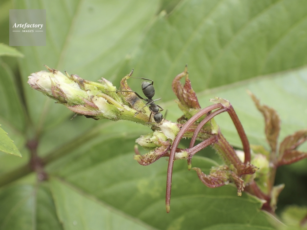 | キャプション | ノウゼンカズラの芽にたかるアブラムシの甘露を舐める アリ科 | 制限事項 | ||