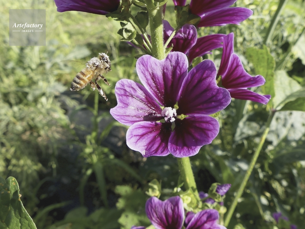 | キャプション | ゼニアオイの花粉を体中につけて飛び立つ ミツバチ科 | 制限事項 | ||