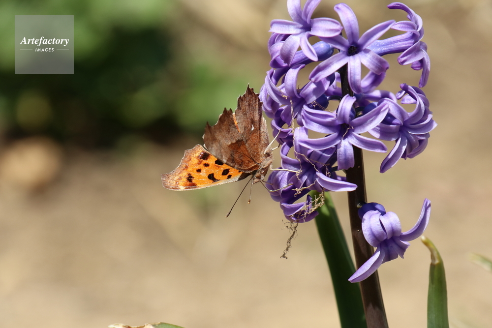 作品タイトル     ヒヤシンスの花から吸蜜するキタテハ モデルリリース なし