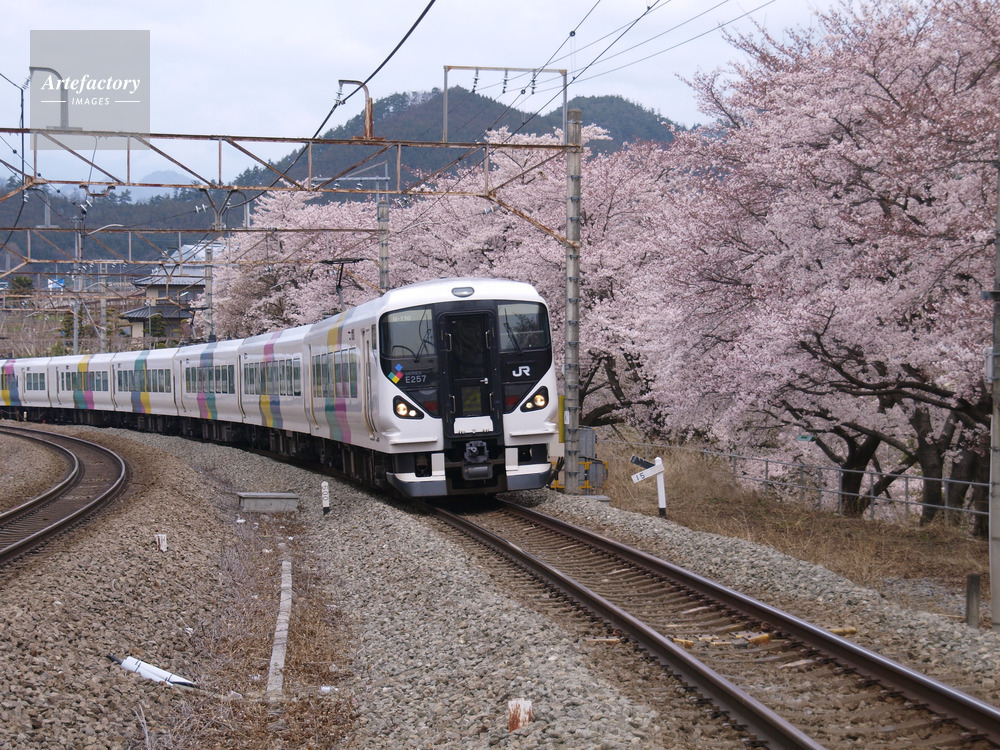 | 作品タイトル | 勝沼ぶどう郷駅の桜並木と特急あずさ号 | モデルリリース | なし | |