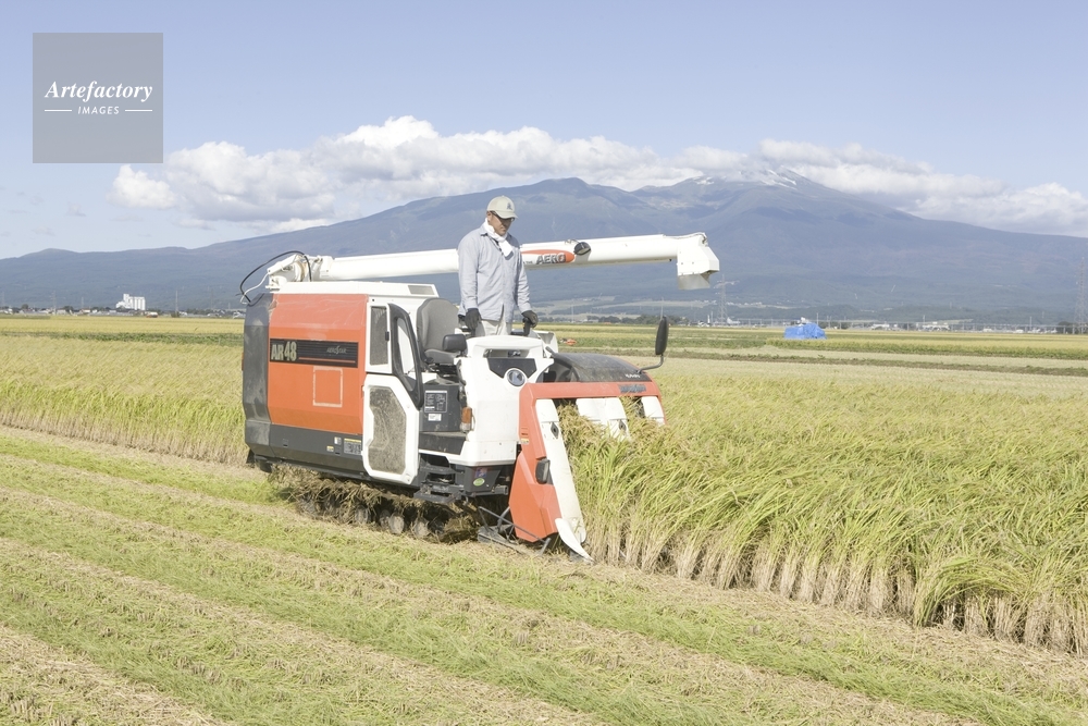 作品タイトル     庄内平野の稲刈り 後方鳥海山 モデルリリース なし