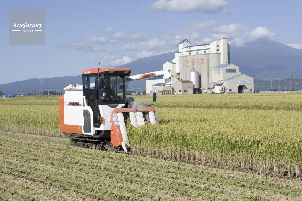 | 作品タイトル | 上田カントリーエレベーター、鳥海山をバックに稲刈り | モデルリリース | なし | |