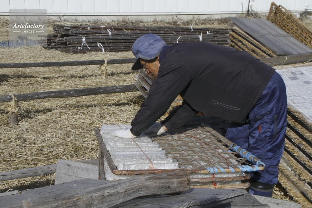 | 作品タイトル | 寒天 天日干し後すかごに並べ替える 冬の水田 | モデルリリース | なし | |