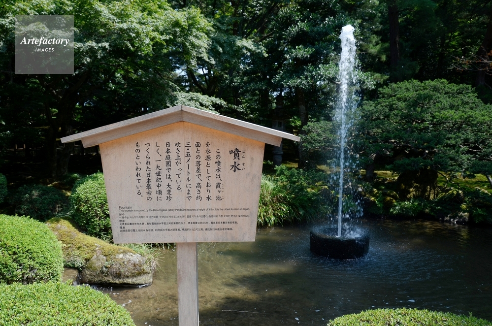 | キャプション | 日本ある最も古い噴水。石川県兼六園内にあり、霞ヶ池を水源として、水面の落差で水を噴き上げるポンプなど動力は使わない | 制限事項 | ||