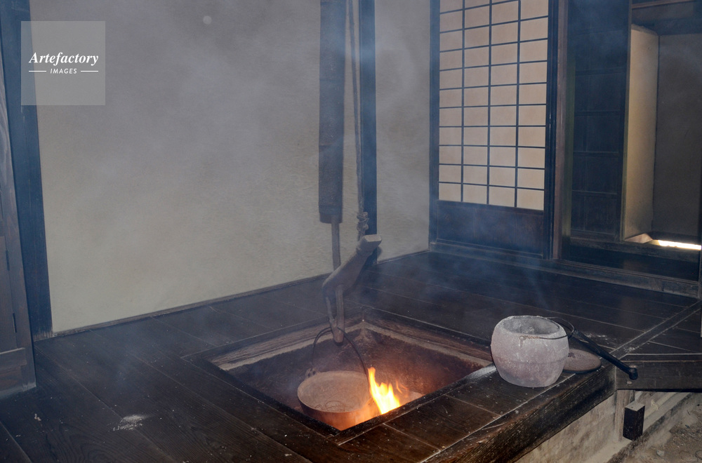 日本,東京都指定有形文化財建造物,旧荻野家住宅,医者の家,囲炉裏,台所土間,火,消火器,煙,いぶす,すす,カヤ,屋根の防虫,屋根の防腐,かやぶき屋敷,保存,建物,屋内,春,