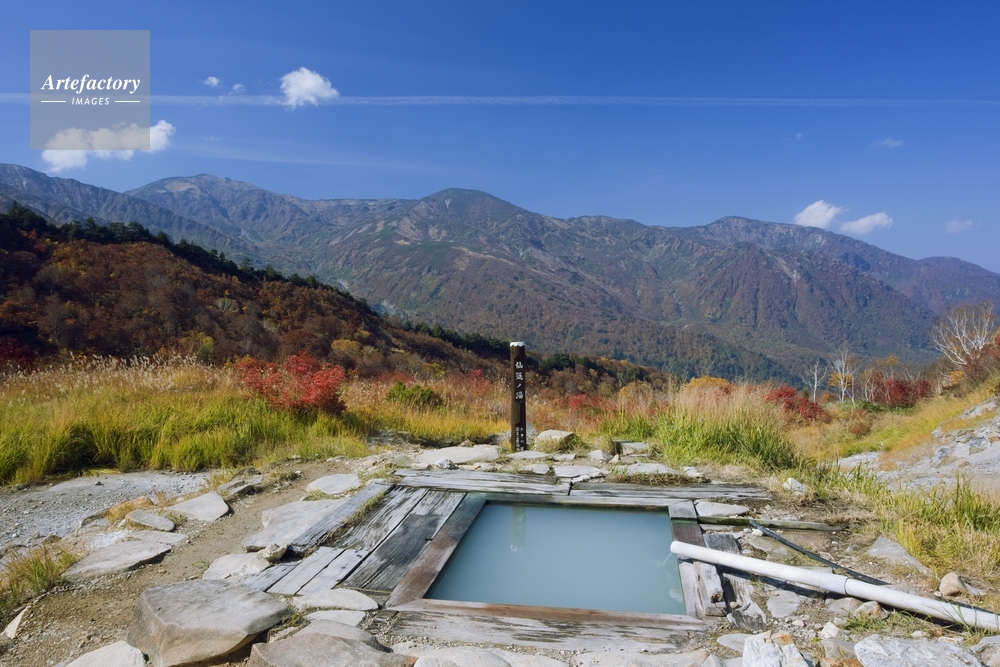 | 作品タイトル | 秋の蓮華温泉 仙気ノ湯より北アルプス | モデルリリース | なし | |