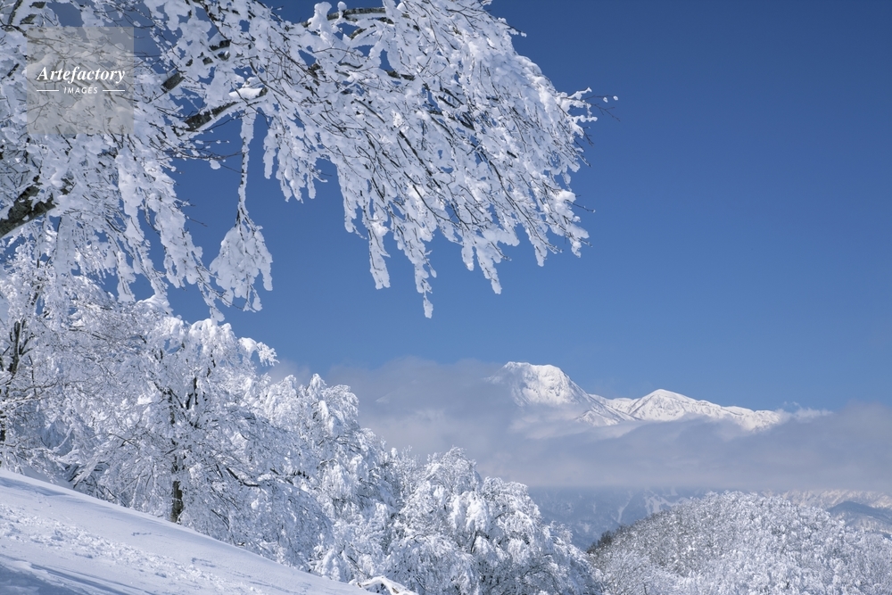 作品タイトル     霧氷の斑尾高原スキー場より妙高山 モデルリリース なし