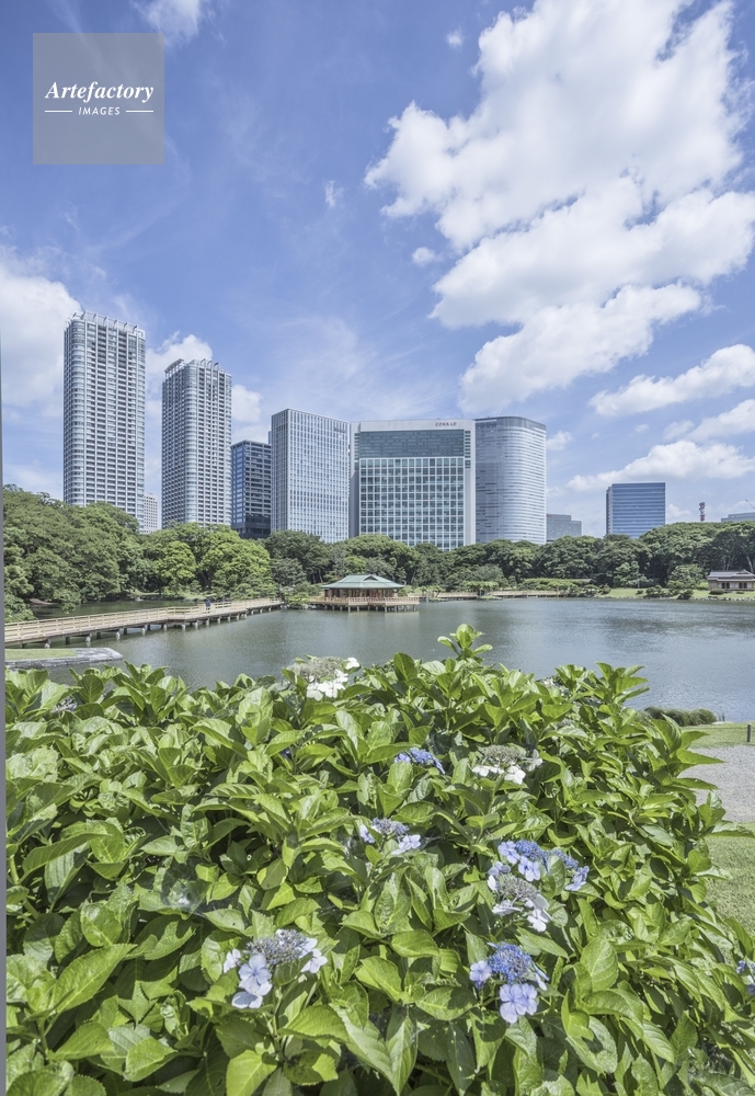 | 作品タイトル | 浜離宮恩賜庭園のアジサイが咲く潮入りの池と高層ビル | モデルリリース | なし | |