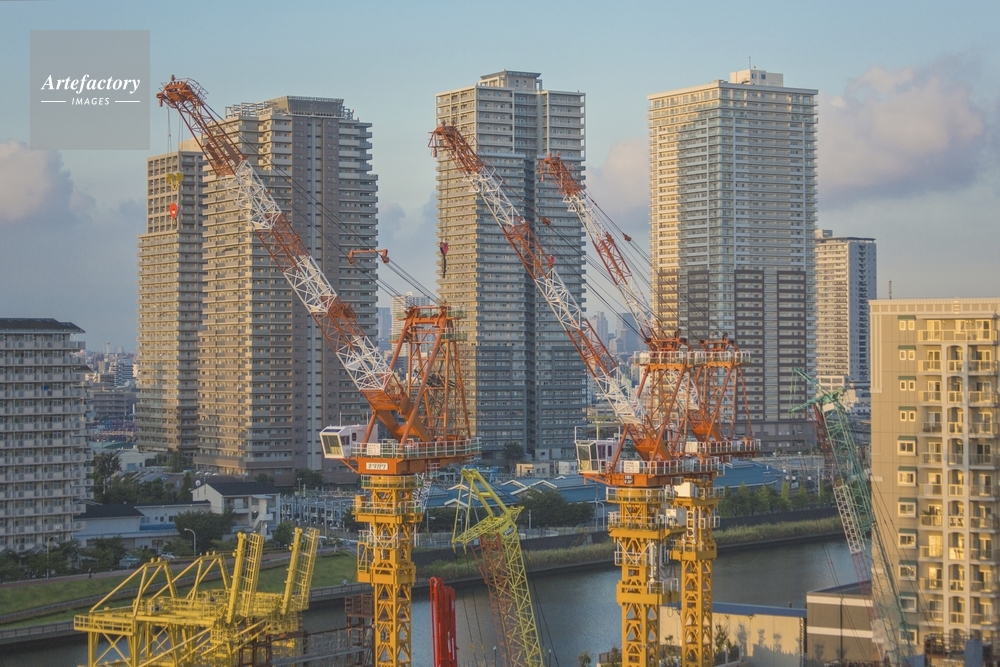 | 作品タイトル | 日の出の太陽を浴びる墨田川沿いの高層マンションと工事現場 | モデルリリース | なし | |