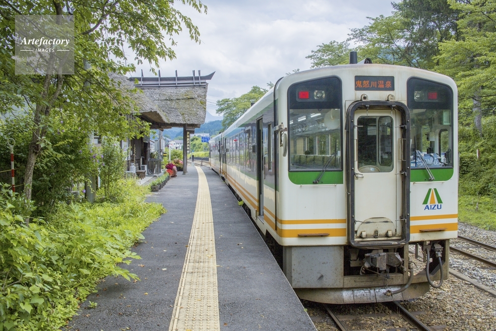 | 作品タイトル | 茅葺き屋根駅舎の湯野上温泉駅と電車 | モデルリリース | なし | |