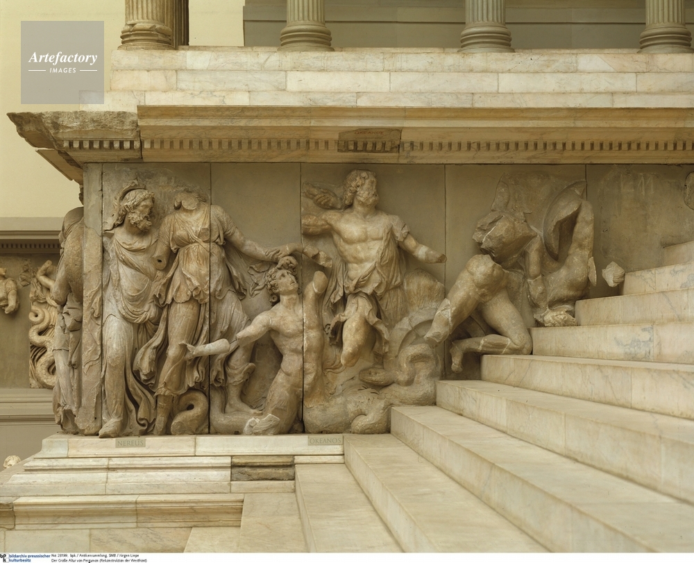 | キャプション | Photo by Jurgen Liepe,Marmor (Hellenistisch (2. Viertel 2. Jh.v.Chr.)),ObjektmaB 34,2 x 36,44 m (Originalmasse),Nordrisalit mit den Meeresgottheiten Nereus, Doris und Okeanos,Inventar-Nr.: Pe. 1,Fundort: Pergamon (Turkei),Systematik:Geschichte / Antike / Vorderasien / Turkei / Pergamon / Architektur | 制限事項 | ||