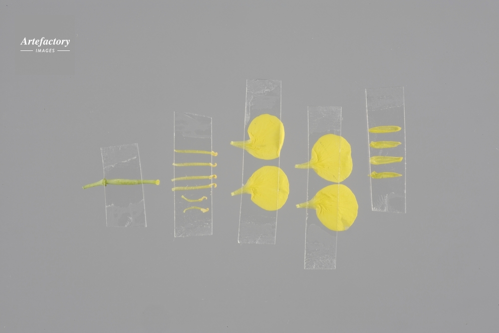 | キャプション | アブラナの花を分解し、上から、がく、花弁、おしべ、めしべの順に並べた。 | 制限事項 | ||