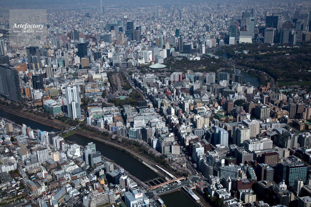 | 作品タイトル | 満開の桜の外堀と市ヶ谷駅周辺より靖国神社,北の丸公園,大手町方面 | モデルリリース | なし | |