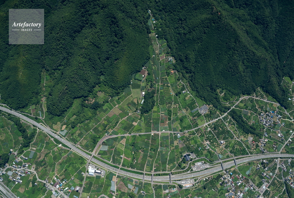 | 作品タイトル | 勝沼,一宮の扇状地と中央高速道路(釈迦堂パーキング付近)俯瞰撮影 | モデルリリース | なし | |