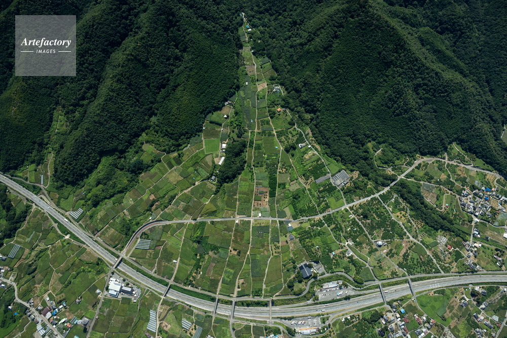 | 作品タイトル | 勝沼,一宮の扇状地と中央高速道路(釈迦堂パーキング付近)俯瞰撮影 | モデルリリース | なし | |