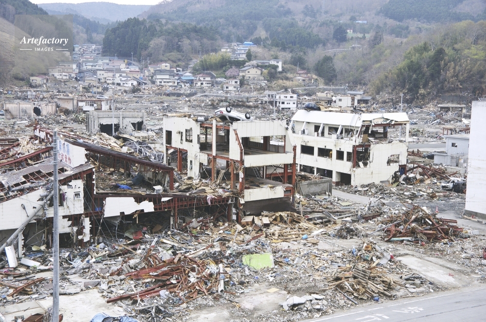| 作品タイトル | 東日本大震災の津波で壊された街と屋根の上に車 | モデルリリース | なし | |