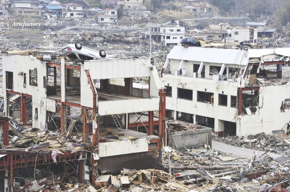 | 作品タイトル | 東日本大震災の津波で壊された街と屋根の上に車 | モデルリリース | なし | |