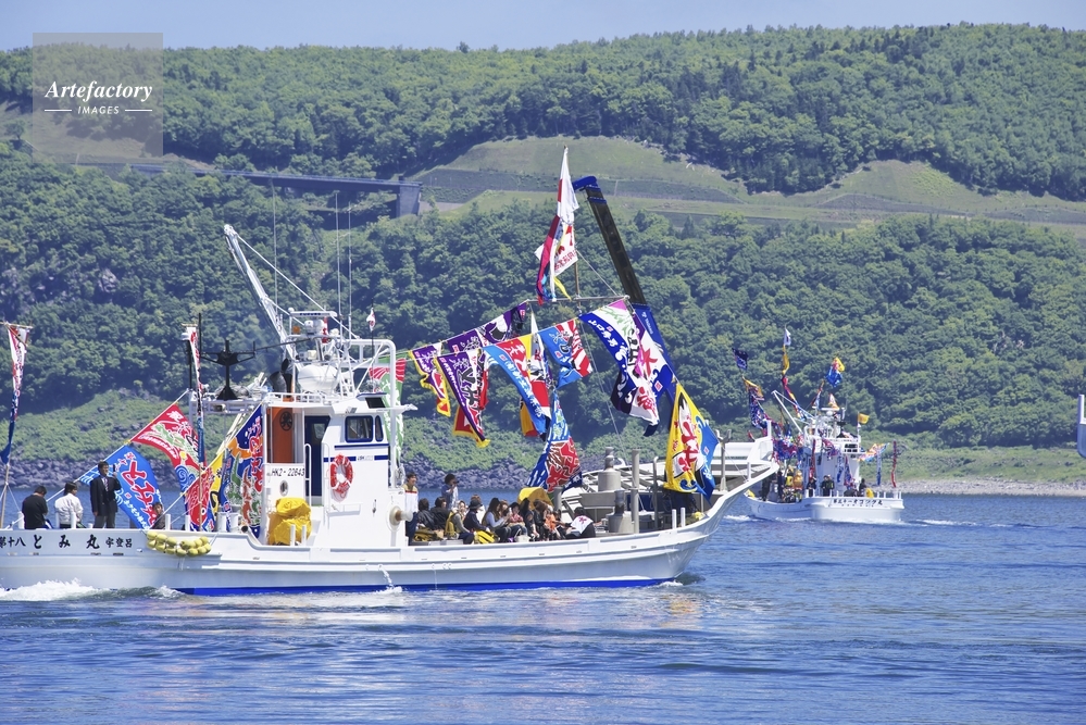 | 作品タイトル | ウトロ漁港を出航する大漁祈願祭の漁船 | モデルリリース | なし | |
