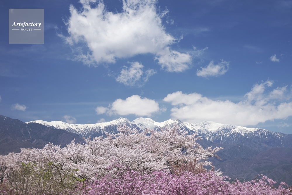 | 作品タイトル | 大草城址公園の桜と中央アルプス | モデルリリース | なし | |