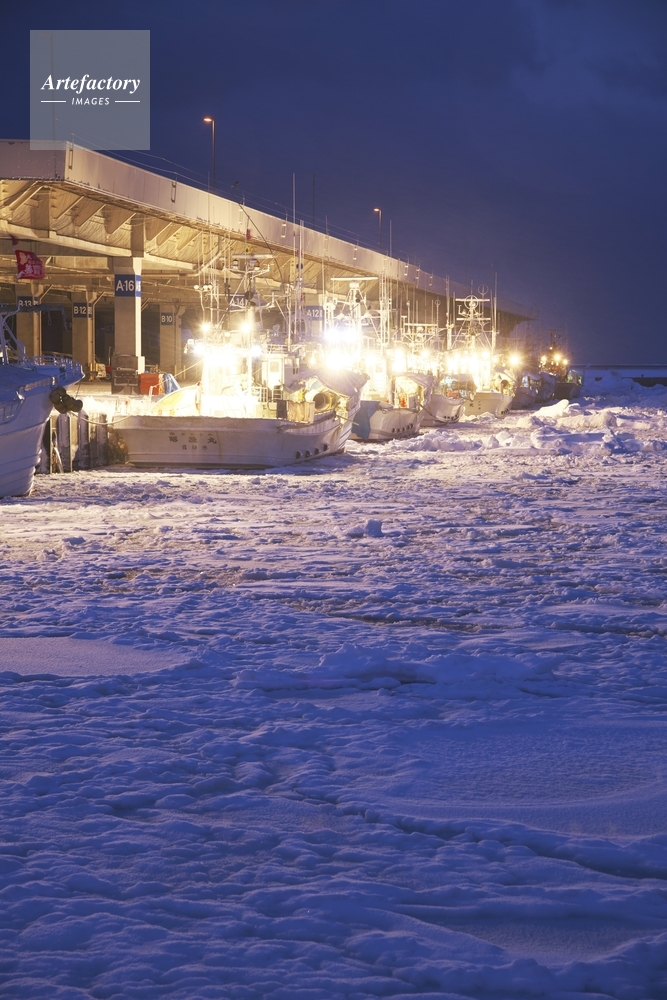 | 作品タイトル | 羅臼港のスケソウ船と朝の流氷 | モデルリリース | なし | |