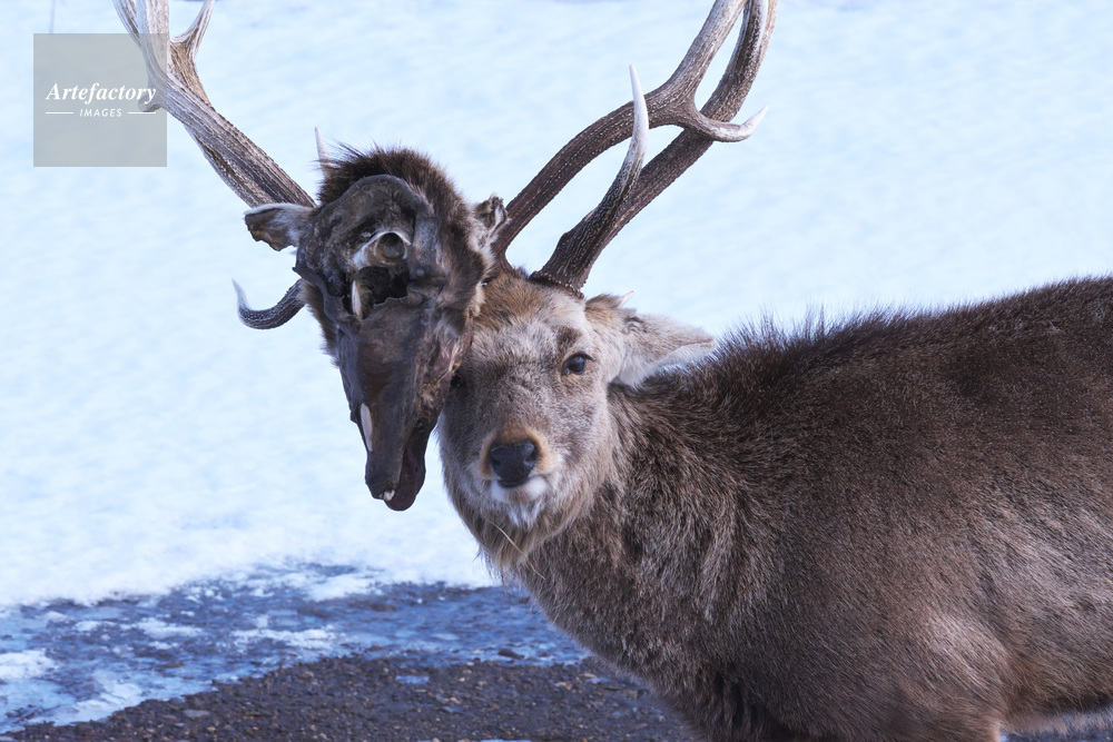 | 作品タイトル | エゾシカのツノにからみついた死骸の頭 | モデルリリース | なし | |