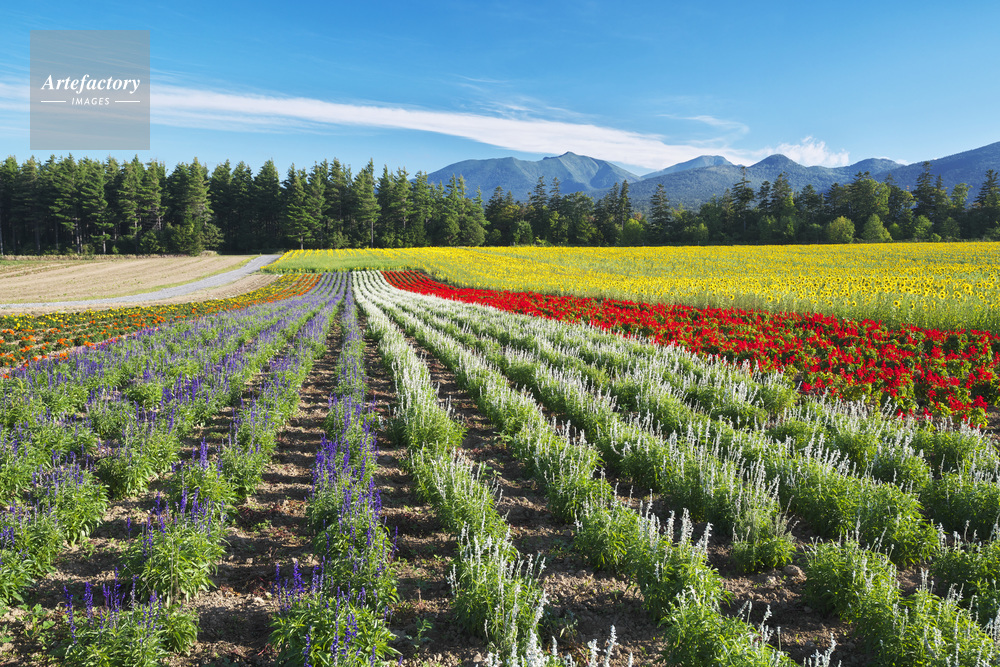 | 作品タイトル | 麓郷展望台の花畑と前富良野岳などの山々 | モデルリリース | なし | |
